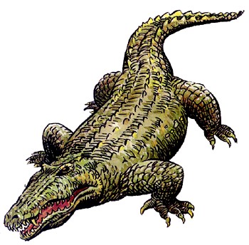 COMBAT : perpétuellement vorace, le crocodile attaque tout ce qui a l’air mangeable, humains y compris. Il préfère se tapir et attendre sa proie (lui imposant ainsi une pénalité de -2 au jet de surprise) et est extrêmement sensible à la moindre fluctuation de l’onde. Il n’est pas rare qu’un tel monstre se rapproche de la rive en silence et qu’il se saisisse d’un homme qu’il entraîne aussitôt sous la surface. Il attaque à l’aide de ses mâchoires, qui délivrent 2d4 points de dégâts, et à grands coups de queue infligeant chacun 1d12 points de dégâts. Les crocodiles se battent entre eux pour s’approprier leurs proies, et ils peuvent ainsi réduire en charpie un corps qu’ils se disputent. Il n’existe qu’une seule chose qui puisse les ralentir : le froid. ils deviennent lents et lourd (VD diminuée de moitié) dès que la température tombe en dessous de 5°C.