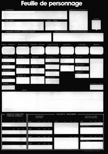 Feuille de personnage recto-verso bilingue (français/anglais), conçue par François Marcela-Froideval et publiée par Jeux Descartes (bloc de 50 feuilles).Informations
