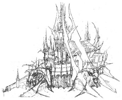 L'intérieur du Temple est un lugubre sanctuaire du mal, avec de sombres colonnes de marbre et douze golems de pierre à la forme de terrifiants griffons semi-reptiliens et aux profonds yeux émeraudes. Des chandeliers de métal sont incrustés de milliers et de milliers de bougies noires qui s'écoulent, suspendues au plafond du temple, et une flamme pourpre brûle au coeur du sanctuaire, sur la septième marche (la plus haute) du dais central qui se tient devant l'autel.