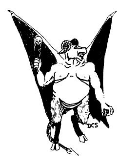 Description : Orcus est un prince démon d’une grosseur obscène, mesurant près de 4,50 m de haut. Son énorme corps grisâtre est recouvert d’une fourrure de bouc ; sa tête emprunte elle aussi ses traits à ce dernier animal, bien qu’elle porte des cornes de bélier. Enfin, ses jambes sont remplacées par des pattes de bouc, ses bras étant par contre humains. De grandes ailes de chauve-souris pointent de son dos, et sa longue queue serpentiforme se termine par un aiguillon venimeux.