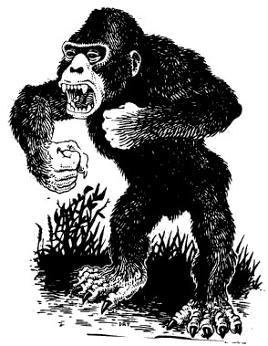 Le gorille carnivore est un cousin plus grand, plus fort et très agressif du gorille. Cet animal possède une intelligence honorable (QI 70+) et est très rusé. Il est particulièrement friand de chair humaine. Un gorille est doté d’une vue, d’un odorat et d’une ouïe très aiguisés : il n’est donc surpris que sur un résultat de 1. Si les attaques de ses deux pattes atteignent leur cible au cours d’un même round, il inflige lui aussi des dégâts supplémentaires par écartèlement (1-8 points).