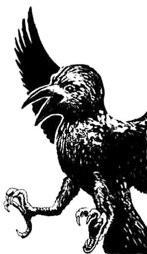 Les corbeaux et les corneilles ont leur propre langage, bien que limité. Certains corbeaux, notamment quelques spécimens énormes et la plupart des corbeaux géants, peuvent parler jusqu’à 100 mots de la langue commune et peuvent communiquer à l’aide de phrases éloquentes. Les corbeaux énormes tendent à avoir un tempérament malveillant et sont connus pour servir des maîtres maléfiques quand les opportunités le permettent. Tous les oiseaux de ce type adorent les objets brillants et scintillants. Ainsi, ils ont 25 % de chances de détenir plusieurs petits objets métalliques, gemmes et autres dans leurs nids. Les corbeaux géants sont à la fois pugnaces et facilement dressés (s’ils sont éduqués à l’état d’oisillons), et sont donc souvent utilisés comme sentinelles ou messagers. Leurs nids recèlent un trésor de type Q (avec 1 chance sur 6 par nid, et une valeur de base des gemmes de 10 po).