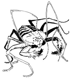 les amblypygi, ou pédipalpes énormes, ont remplacé une paire de pattes par deux appendices ressemblant à des fouets. À l’extrémité des pinces épineuses, une autre paire de pattes s’est développée, ce qui permet à ces créatures d’attaquer leurs proies. Elles mordent aussi. Après un jet d’attaque réussi, le pédipalpe énorme saisit sa proie et inflige des dégâts automatiques d’écrasement (identique à deux frappes de pinces : 2-12) à chaque round suivant. Les chances qu’un personnage puisse échapper à cette saisie sont les mêmes que pour ouvrir les portes.