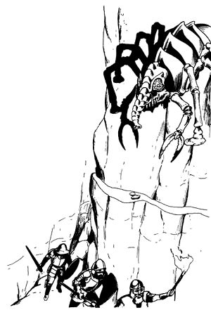 Les crabes-pêcheurs sont des créatures à carapace dure et dotées de nombreuses pattes qui vivent en piégeant les animaux dans les mondes souterrains. Pour piéger sa proie, un crabe-pêcheur emploie un filament très solide et hautement adhésif qu’il étire de sa trompe. Ce filament fait 18 m de long, et se termine à son extrémité par une ventouse au suc extrêmement collant. Un crabe-pêcheur peut lancer ce filament à une grande vitesse et avec précision, frappant comme un monstre à 6 dés de vie. Il fait « remonter » sa proie au rythme de 4,50 m par round, utilisant un treuil organique complexe logé dans une protubérance renforcée derrière sa tête. Un crabe-pêcheur peut soulever une proie pesant 200 kg (le poids de 4 000 po). La colle de la ventouse recouvre aussi le filament et peut être dissoute par un liquide avec une forte teneur en alcool, ou du sang de crabe-pêcheur, qui lui aussi contient beaucoup d’alcool. Les filaments sont si résistants qu’ils ne peuvent être coupés que par des armes tranchantes +1 ou mieux, et si fins qu’il n’y a que 20 % de chances de les remarquer dans les 3 m et aucune au-delà.