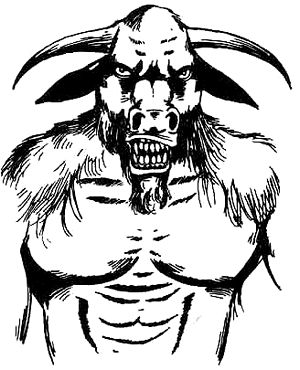 Baphomet est le seigneur des minotaures ; il a l’apparence d’un ogre avec une énorme tête de taureau. Yeenoghu le hait particulièrement et les deux sont en guerre permanente. En combat, Baphomet attaque en premier en donnant un coup de corne et en mordant, puis en utilisant son énorme bardiche qui inflige 11-20 (3d4+8) points de dégâts. Les porteurs d’armures, de boucliers et d’autres objets frappés par l’instrument doivent réussir un jet de protection contre les chocs violents ou voir l’objet détruit. Baphomet a 75 % de chances d’être avec 2-5 minotaures ; il peut en invoquer 5-8 de plus, en un seul round s’il le faut, bien qu’il ne puisse faire cela qu’une fois par jour.