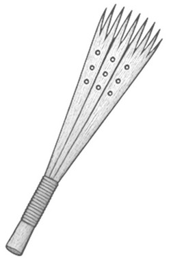 Arme préférée des cavaliers, le bâton à lapins peut être utilisé pour tuer le petit gibier et blesser des ennemis à pieds. Pour fabriquer un bâton à lapins, deux bandes plates de bois d'environ 90 cm de long et de 7,5 cm de large sont attachées à un bout. De longues entailles sont coupées aux extrémités libres puis acérées en fines pointes. Plusieurs trous sont percés au centre de la bande pour réduire la résistance à l' air. L'utilisateur tient le bâton à lapins par les extrémités attachées puis fait claquer ou fait cingler les extrémités entaillées sur la cible.