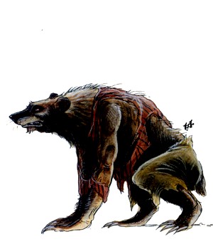HABITAT/SOCIÉTÉ : les ours-garous sont le plus souvent solitaires. Sous leur forme humaine, ils se construisent une cabane loin des autres habitations, préférant se trouver un coin situé au coeur d’une forêt et à proximité d’une source d’eau potable. Ils ne se marient jamais, encore qu’ils puissent parfois avoir un compagnon ou une compagne qu’ils vont retrouver à intervalles irréguliers. Les femmes donnent naissance à un ou deux enfants, qui sont toujours robustes et grandissent rapidement. Ils deviennent adolescents à l’âge de 8 ans et acquièrent alors la faculté de se transformer en ours-garou. peu de temps après, leur mère les chasse de chez elle et se cherche un compagnon pour recommencer le cycle. Les jeunes nouvellement indépendants sont discrètement aidés et conseillés par des ours-garous plus âgés, car malgré leur tendance à l’isolement et leur individualisme affiché, ces êtres ont le sens de l’entraide. Ils ne se combattent jamais entre eux et viennent toujours au secours de l’un des leurs opposé à un autre lycanthrope.