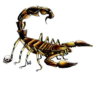 Ces créatures, que l’on trouve souvent dans les souterrains et les régions non civilisées, sont tout bonnement de plus petites variétés du scorpion géant. Leur couleur va de l’ocre au noir en passant par le brun, encore que certaines rumeurs fassent état de scorpions blancs particulièrement rares qui vivraient uniquement sous terre. Tous attaquent à l’aide de leurs pinces et de leur queue, dont le dard délivre un venin faisant effet dès le round suivant. Celui du gros scorpion est assez faible (+2 au jet de sauvegarde, 15 points de dégâts en cas d’échec, 0 en cas de réussite), tandis que celui de l’énorme est le même que celui de la variété géante (poison de type F). L’énorme scorpion peut lui aussi saisir ses adversaires à l’aide de ses pinces, à la différence que les créatures ainsi attrapées peuvent continuer de se battre. Il n’est pas rare que des scorpions de taille diverse se battent entre eux.