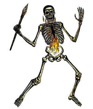 Le squelette peut, 1 fois par heure (6 tours), glisser la main entre ses côtes et en tirer une poignée de flammes qu’il lui est possible de jeter comme s’il s’agissait d’une boule de feu infligeant 8d6 points de dégâts (total réduit de moitié en cas de jet de sauvegarde réussi). Étant lui-même immunisé contre le feu sous toutes ses formes, il n’hésite pas à utiliser cette attaque dans un espace clos.