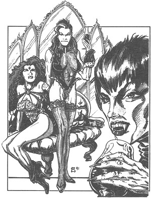 HABITAT/SOCIÉTÉ : Les vampyres vivent en meutes de 12 individus maximum, les deux sexes étant également représentés, additionnés d’une demi-douzaine de jeunes. Ils ne rencontreront que rarement d’autres meutes, mais quand cela se produit, les deux meutes s’assemblent pour quelques jours et se lancent dans une terrible bacchanale qui sème la terreur et la mort dans leur voisinage.