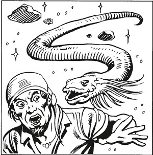 Un ver spatial ressemble à une limace de mer blanchâtre et luisante mesurant jusqu’à 90 cm de longueur. Ils fondent sur les vaisseaux, dévorant les coques de bois ou d’os et attaquant l’équipage. S’ils sont particulièrement affamés, ils s’infiltrent pour dévorer la nourriture dans les cales, les marins endormis, etc.