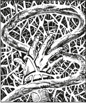 HABITAT/SOCIÉTÉ : Une vigne infinie ne pousse pas du tout sur les corps planétaires de plus de 150 km de diamètre, sans tenir compte de la lumière ou de l’air que la plante reçoit. Quand elle est exposée au phlogiston, elle se flétrit immédiatement, devenant marron foncé et extrêmement cassante. Cependant, elle n’est pas morte mais simplement inerte ; si elle est exposée à nouveau à l’air et à la lumière dans l’espace sauvage, la plante reprend conscience, restaurant toutes les zones endommagées après un délai de 1 tour.