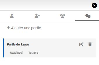 - Ajout d'un nouvel onglet Parties dans le Panneau utilisateurs pour créer une ou plusieurs parties que les personnages pourront rejoindre depuis leur formulaire