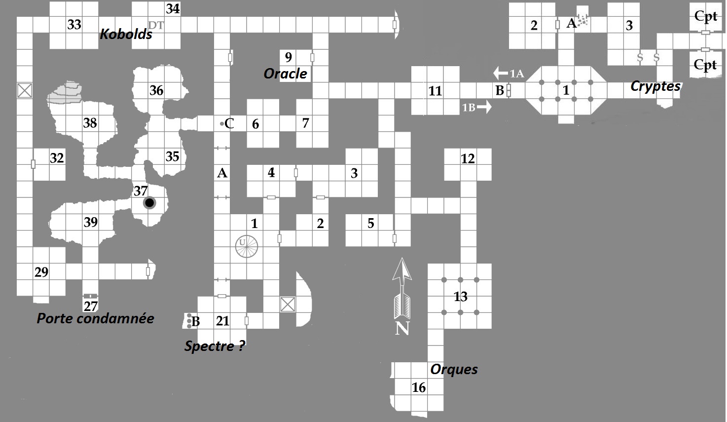 En rassemblant leurs souvenirs et leurs notes éparses, les aventuriers parviennent à reconstituer le plan des parties du complexe souterrains qu'ils ont déjà explorées...Précédemment dans [i]Stonehell[/i] a écrit : A leur sortie des souterrains de la montagne, le groupe fait la rencontre d'un grand nordien venu s'installer dans le canyon de Stonehell avec toute sa clique de cosaques et d'associés et bien décidé à monter un comptoir à destination des aventuriers dans l'ancien poste de garde. Il leur dit s'appeler Eipsellig et leur offre à la fois équipement et informations contre argent sonnant et trébuchant.
