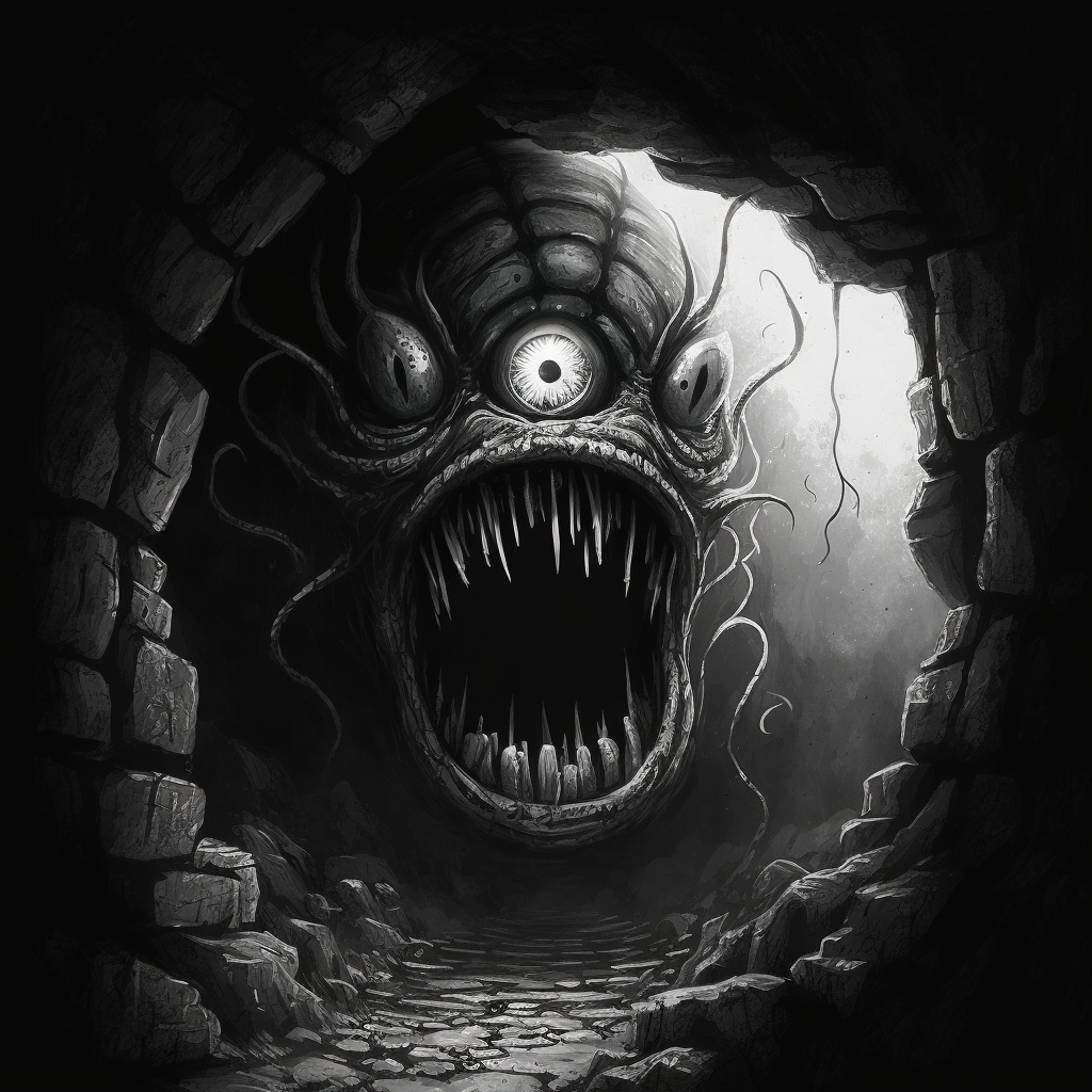 Midjourney Prompt (Texte) : Imagine a creature resembling a mix between a lobster::1 and a spider appears in a cave.